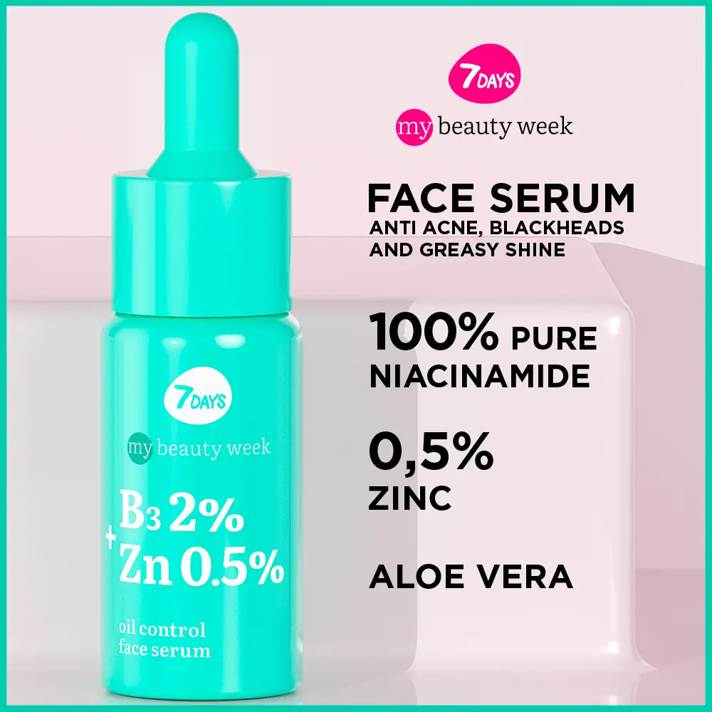 7DAYS B3 2% + ZN 0.5% Facial Serum 20ML targets oily, acne-prone skin with a lightweight, matte finish. This 20 ml formula combines niacinamide 2% and zinc 0.5% to reduce blackheads and imperfections while supporting the skin’s barrier and balancing sebum. A compact bottle with a precise dispenser ensures controlled application, helping minimize pore appearance and maintain renewed, even-toned skin.