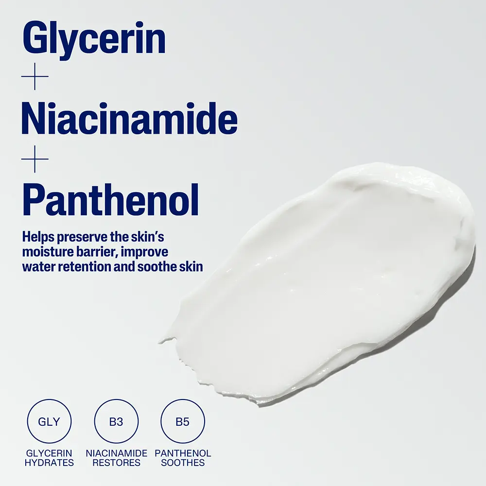 | Ingredients | aqua, glycerin, petrolatum, dicaprylyl ether, dimethicone, glyceryl stearate, cetyl alcohol, helianthus annuus (sunflower) seed oil, peg-30 stearate, panthenol, niacinamide, prunus amygdalus dulcis (sweet almond) oil, tocopheryl acetate, pantolactone, dimethiconol, acrylates/c10-30 alkyl acrylate crosspolymer, carbomer, propylene glycol, disodium edta, benzyl alcohol, phenoxyethanol, sodium hydroxide, citric acid. |