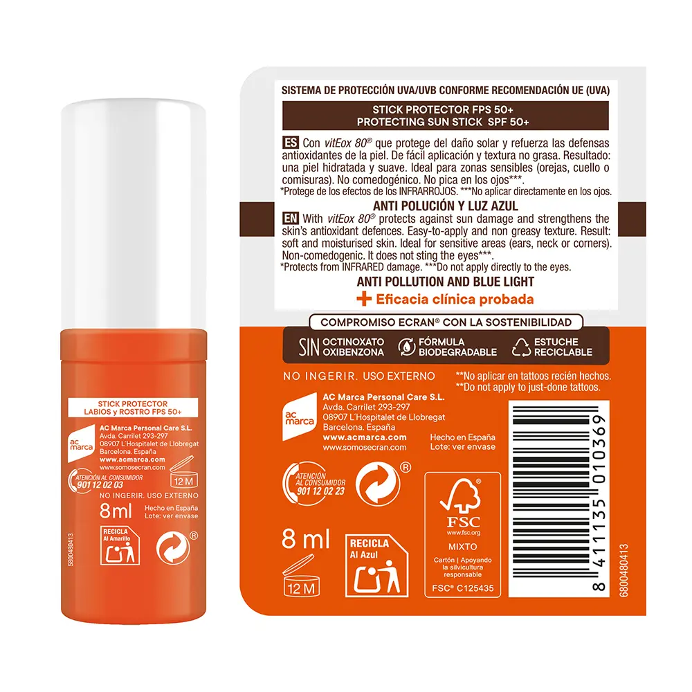 A lip and face sunscreen in a convenient stick format enriched with vitamin E and antioxidant properties. Provides reliable defense with Very High SPF 50+ and a clear, invisible finish that feels light and non-greasy.