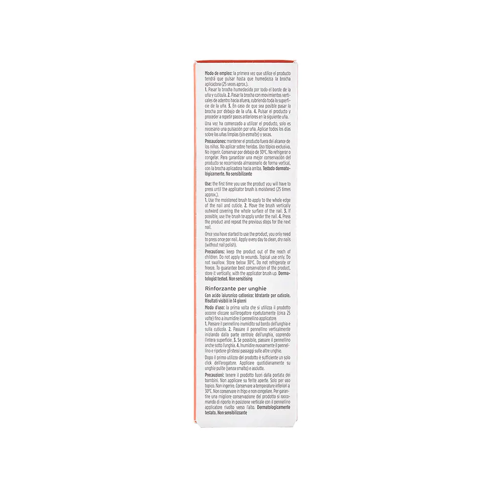Ingredients | Ácido hialurónico catiónico: con un gran potencial de adhesión a la piel, cabello y uñas que le permite mantener su capacidad de hidratación durante más tiempo. Aceite de lentisco (Pistacia Lentiscus): Estimula la síntesis de queratinas duras y de proteínas asociadas a la queratina, aumentando el grosor de las uñas, fortaleciéndolas. Silicio orgánico: penetra fácilmente en las uñas favoreciendo el crecimiento y la calidad de las uñas |