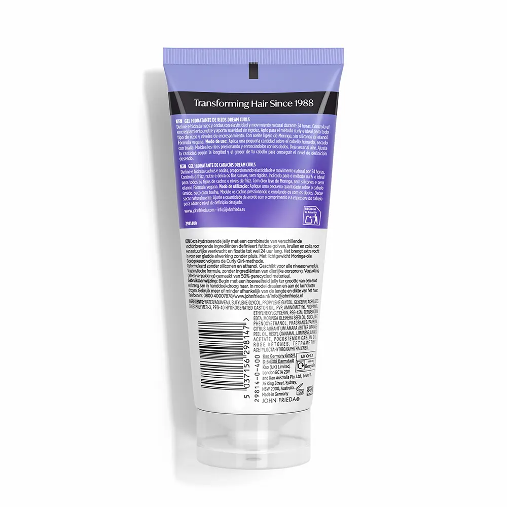 John Frieda Dream Curls Hydrating Gel enhances lifeless waves, curls, and coils with deep moisture and a firm, long-lasting hold. Infused with light moringa oil, this lightweight formula nourishes hair while keeping it soft and touchable—no stiffness—so curl definition, elasticity, and natural movement are preserved.