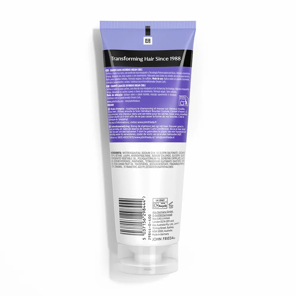 Frizz Ease Dream Curls Shampoo helps define curls and tame frizz, while the John Frieda formula delivers smooth, naturally textured hair. The 250ml bottle offers lightweight cleansing that supports curl formation and long-lasting shape with every wash. Ideal for all curl types seeking defined, less frizzy results, this shampoo is a reliable choice for everyday styling without weighing curls down.
