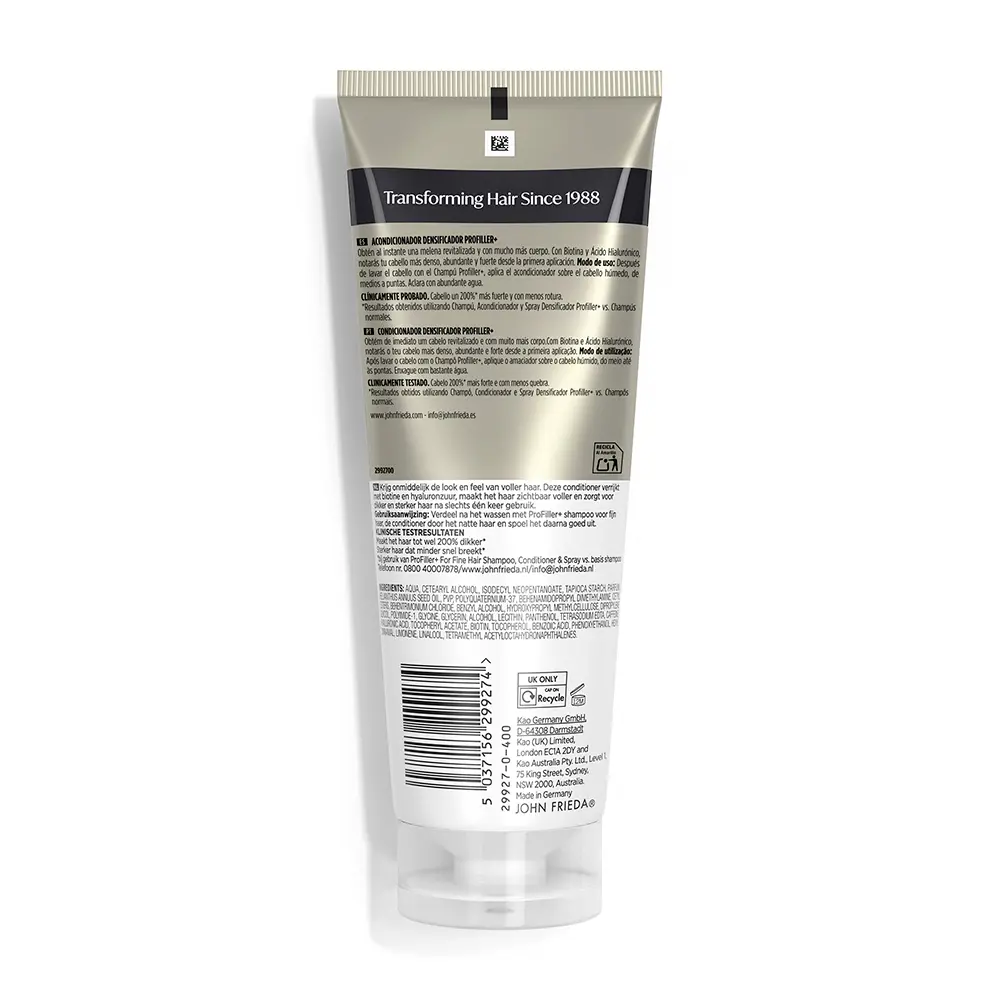 John Frieda Profiller+ Densifying Conditioner 250 ml delivers lightweight conditioning to create fuller-looking hair without weighing it down. This Profiller+ Densifying Conditioner helps detangle, smooth cuticles, and leave hair soft, manageable, and easier to style. Designed for fine or thinning hair, it supports a denser appearance with each wash, helping hair look healthier and more voluminous, without heaviness, boosting shine and manageability.