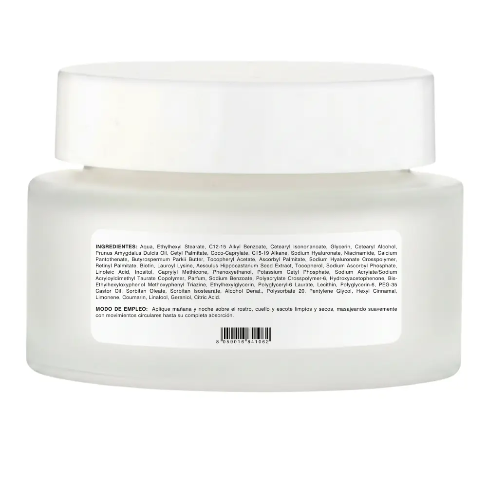 | Ingredients | aqua, glycerin, c12-15 alkyl benzoate, dicaprylyl ether, ethylhexyl palmitate, glyceryl stearate, ceteary isononanoate, coco caprylate, betaine, sodium hyaluronate, sodium hyaluronate crosspolymer, cynara cardunculus seed ol bisabolol, butyrospermum parki buter, tocopheryl acetate, opuntia ficus-indica stam extract, panthenol athenie nobis flower extract, centauren cyanus flower extract, cemella asiatica extract, ethylhexylglycerin, tocopherol, lecithin ascorbyl palmitate, tetrasodium glutamate diacetate palmitic acid, re-ethylhexylcayphenol methoxyphenyl traine sodium benzoate, carbomer, behenyl alcohol, sodium stearoyl glutamate, stearic acid, parfum, arachidyl alcohol hydroxyacetophenone, polyacrylate crosspolymer-6 arachidyl glucoside, xanthan gum, propylene glycol, pantylene glycol, myristic acid, potassium sorbate, phenoxyethanol, sodium hydroxide, peg-100 stearate, citric acid. |