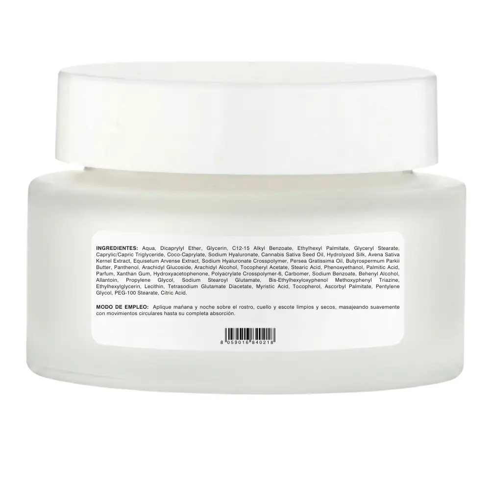 | Ingredients | aqua, dicaprylyl ether, glycerin, c12-15 alkyl benzoate, ethylhexyl palmitate, glyceryl stearate, caprylic/capric triglyceride, coco-caprylate, sodium hyaluronate, cannabis sativa seed oil, hydrolyzed silk, avena sativa kernel extract, equisetum arvense extract, sodium hyaluronate crosspolymer, persea gratissima oil, butyrospermum parkii butter, panthenol, arachidyl glucoside, arachidyl alcohol, tocopheryl acetate, stearic acid, phenoxyethanol, palmitic acid, parfum, xanthan gum, hydroxyacetophenone, polyacrylate crosspolymer-6, carbomer, sodium benzoate, behenyl alcohol, allantoin, propylene glycol, sodium stearoyl glutamate, bis-ethylhexyloxyphenol methoxyphenyl triazine, ethylhexylglycerin, lecithin, tetrasodium glutamate diacetate, myristic acid, tocopherol, ascorbyl palmitate, pentylene glycol, peg-100 stearate, citric acid. |