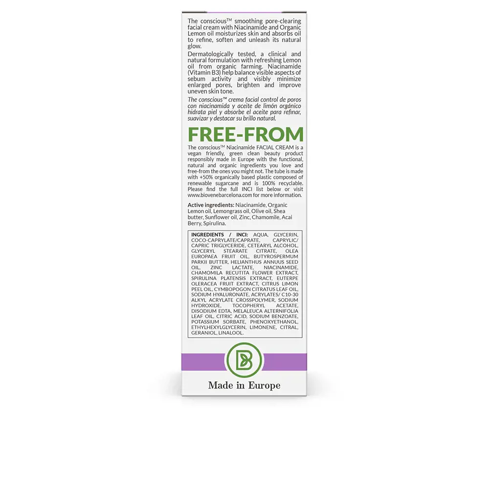 | Ingredients | aqua, glycerin, coco-caprylate/caprate, caprylic/ capric triglyceride, cetearyl alcohol, glyceryl stearate citrate, olea europaea fruit oil, butyrospermum parkii butter, helianthus annuus seed oil, zinc lactate, niacinamide, chamomila recutita flower extract, spirulina platensis extract, euterpe oleracea fruit extract, citrus limon peel oil, cymbopogon citratus leaf oil, sodium hyaluronate, acrylates/ c10-30 alkyl acrylate crosspolymer, sodium hydroxide, tocopheryl acetate, disodium edta, melaleuca alternifolia leaf oil, citric acid, sodium benzoate, potassium sorbate, phenoxyethanol, ethylhexylglycerin, limonene, citral, geraniol, linalool. |