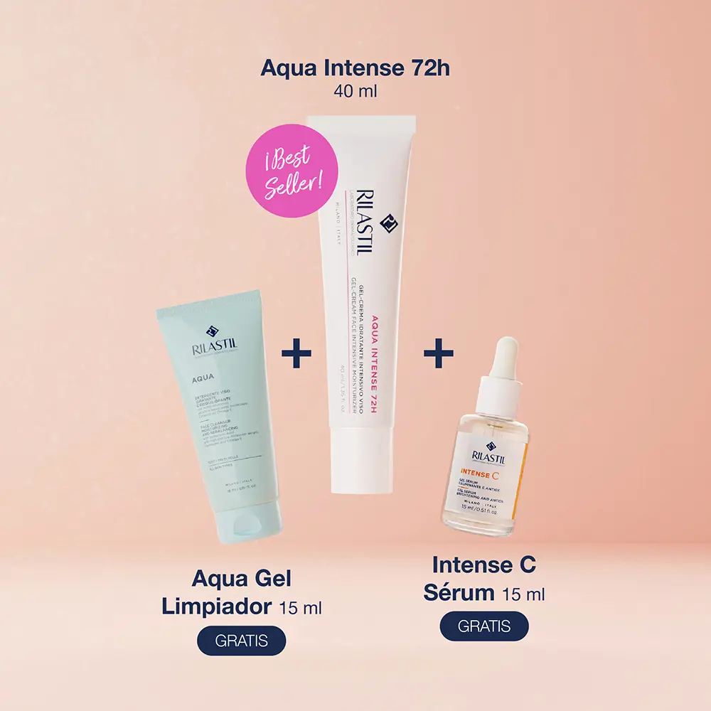 A targeted hydration trio formulated with hyaluronic acid and ceramides. Rilastil Aqua Intense 72H Hydration combines a facial cream gel (40 ml), a gentle facial cleanser (15 ml) and a concentrated facial serum gel (15 ml) to deliver lightweight, non-greasy moisture while respecting sensitive skin.