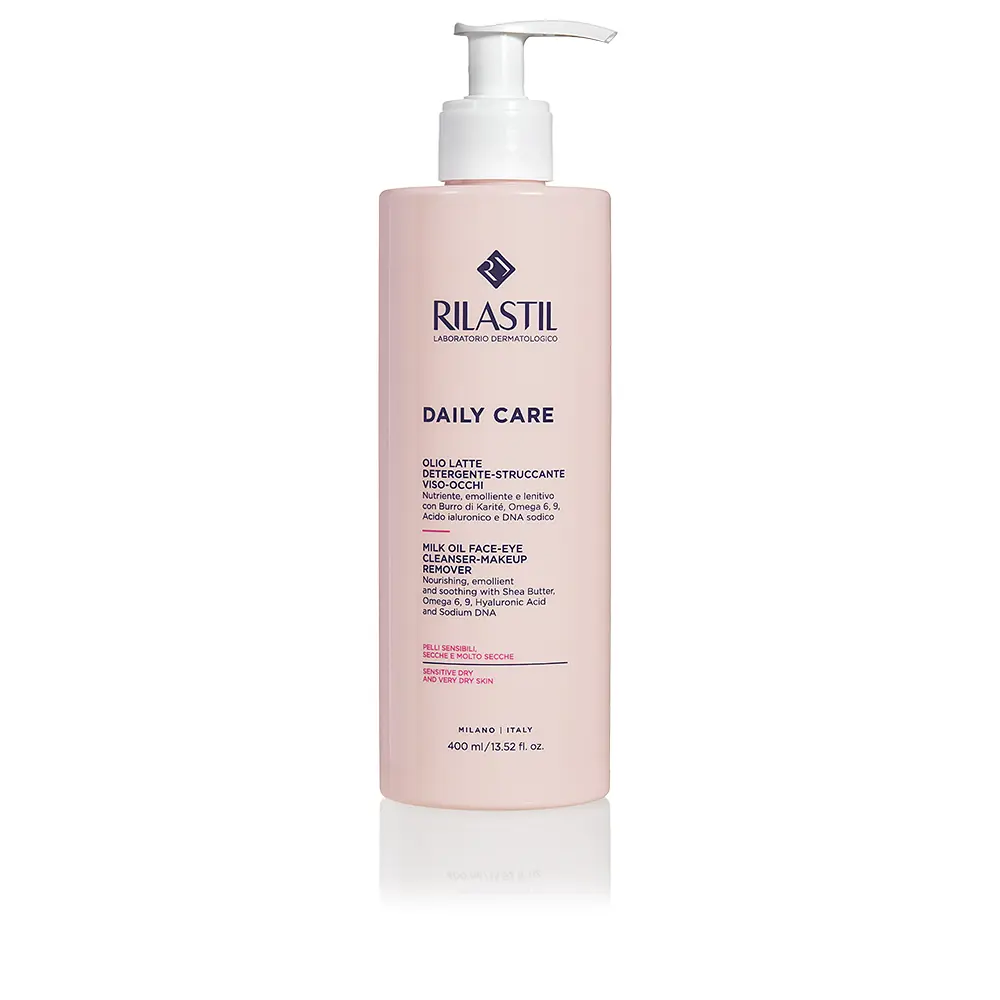 RILASTIL Daily Care Oil Milk 400ml is a gentle cleansing milk-oil that removes makeup and impurities while nourishing sensitive, dry and very dry skin. Enriched with Shea Butter, Sunflower Oil, omega-6 and omega-9, and Sodium DNA, it calms, rebalances and nourishes. High molecular weight Hyaluronic Acid helps lock in moisture. Hypoallergenic and fragrance-free, this non-comedogenic formula reduces TEWL by 18% and erythema by 21%.