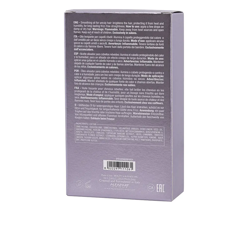 Smooth Smoothing Oil 100ML by ALFAPARF MILANO is a smoothing oil that enhances shine in your locks and shields hair from heat and humidity, delivering a sleek, frizz-free look that lasts.