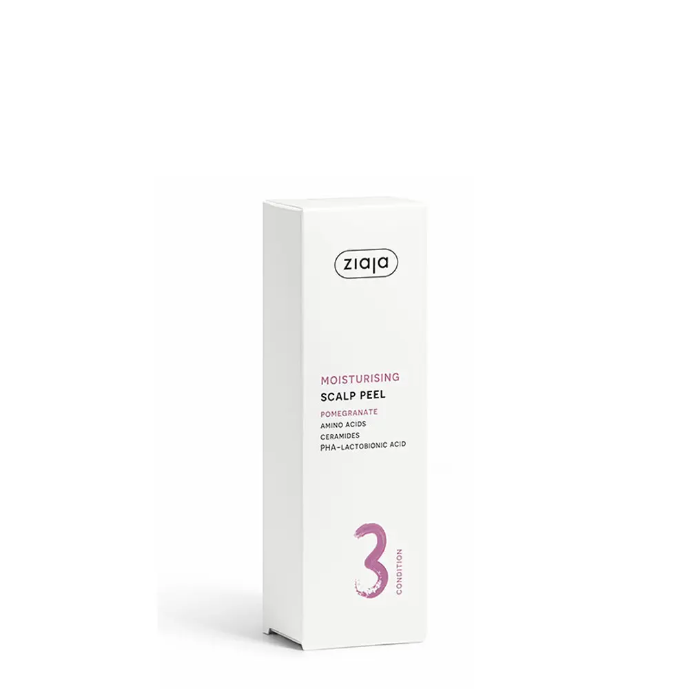 Pomegranate Moisturizing Hair Peeling 100ML from ZIAJA Plant Essentials cleanses, exfoliates and hydrates scalp with ceramides and lactobionic acid. This vegan, 95% natural formula foams lightly and rinses off while guarding moisture loss and restoring shine, softness and elasticity. Enriched with pomegranate phytosterols, vitamins E, C, B3, B5, B6, plant-based keratin, hyaluronic acid and shea butter for a strengthened barrier. Fragrance: rosebuds and cotton flowers with blossoms and musk-vanilla undertones.